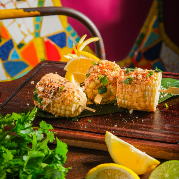 Traditional Corn with Chipotle Mayo, Chilli Powder, Queso Fresco & Coriander.
